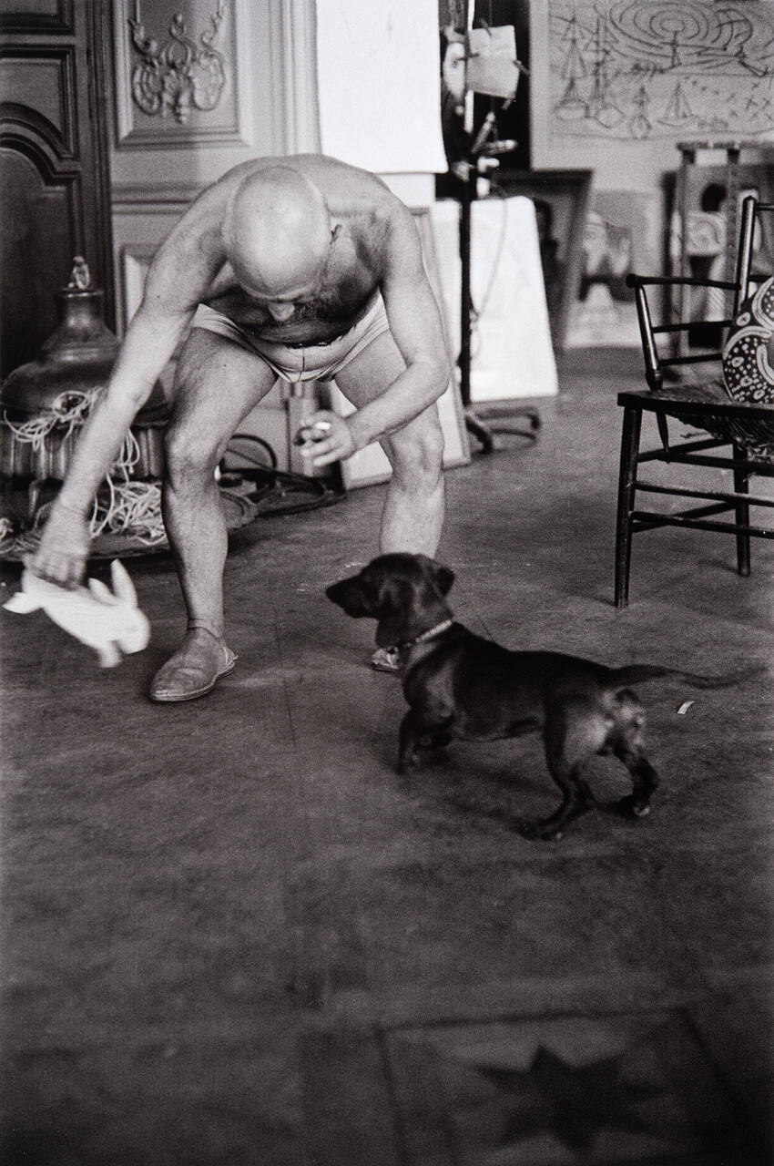 DescriptionImage of Picasso holding paper rabbit next to dog.Copyright© Harry Ransom Center, The University of Texas at Austin