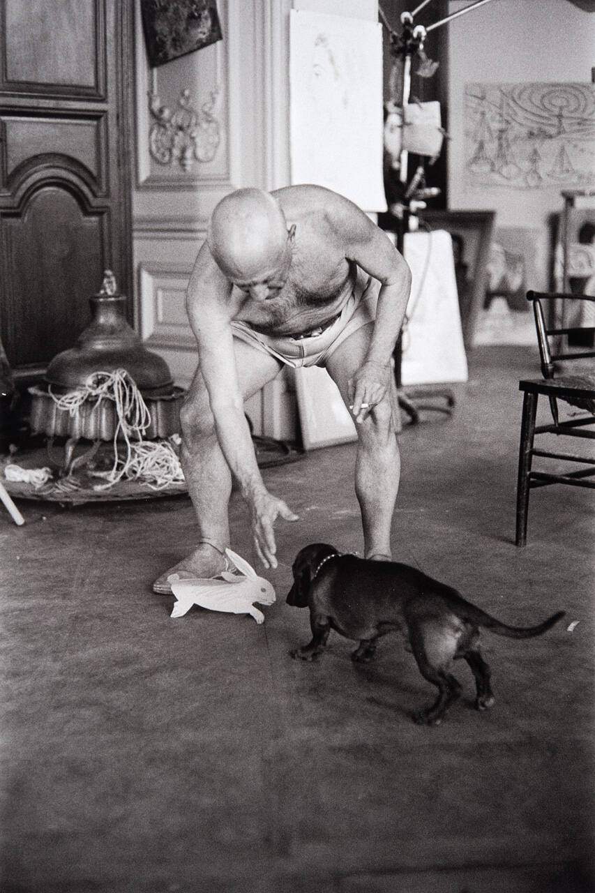 DescriptionImage of dachshund sniffing paper rabbit with Picasso nearby.Copyright© Harry Ransom Center, The University of Texas at Austin