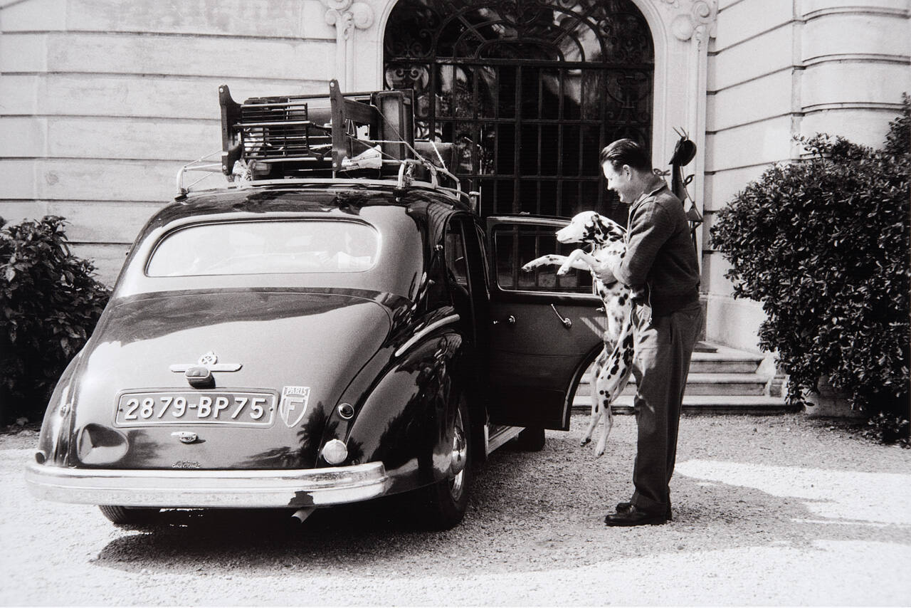 Janot tosses dangling Perro into the over-burdened elegant old limousine, as Picasso and Jacqueline leave for Vauvenargues, near Aix-en-Provence