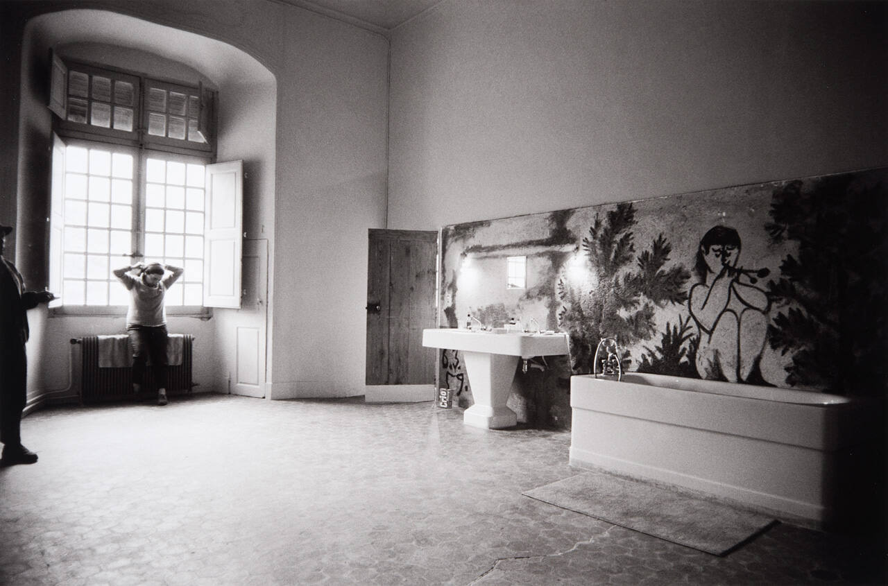 Jacqueline arranging her hair in the morning sunlight while seated on a newly installed radiator in the bathroom of the château