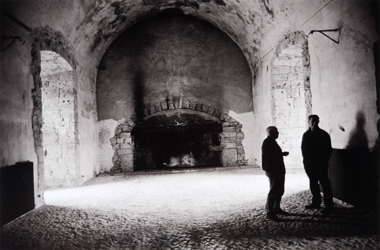 The vast ceremonial hall of the château dwarfing Picasso and his son Paulo, as the artist explains his daydream plans for the vaulted room, which he never touched