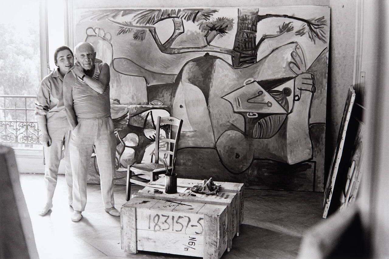 DescriptionImage of Jacqueline leaning on Picasso with large canvas behind them.Copyright© Harry Ransom Center, The University of Texas at Austin