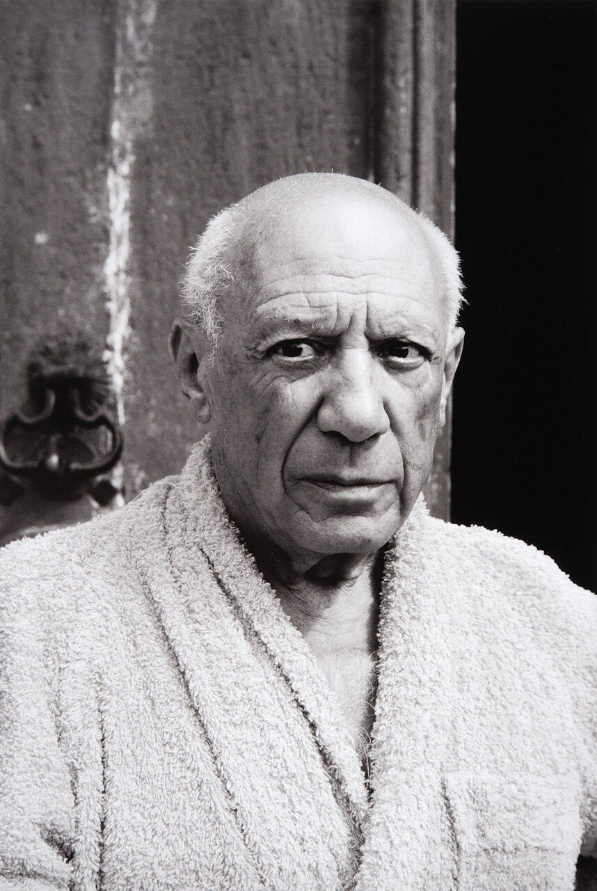 DescriptionImage of Picasso in bath robe.Copyright© Harry Ransom Center, The University of Texas at Austin