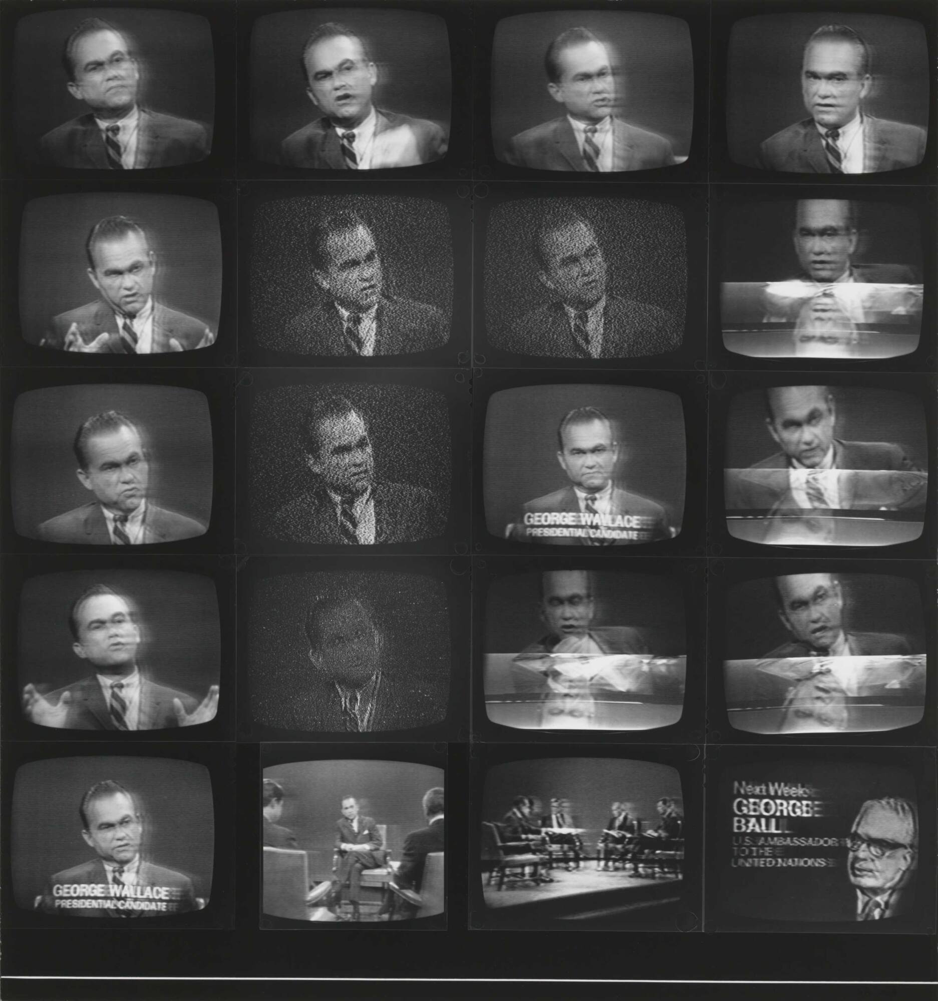 DescriptionImage of 20 television screens many of which show George Wallace, Presidential Candidate.Copyright© Donald Blumberg