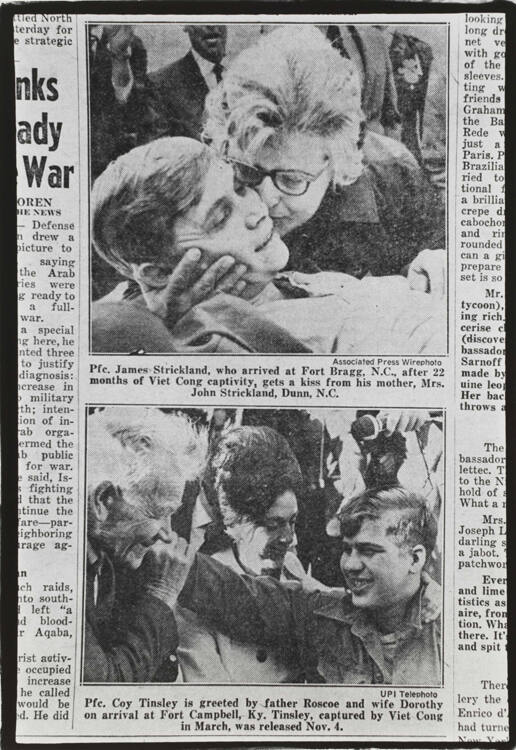 DescriptionImage of a newspaper with photograph of woman kissing son.Copyright© Donald Blumberg