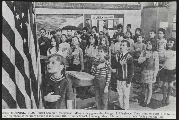 DescriptionImage of a newspaper with a photograph of children pledging allegiance to the United States flag.Copyright© Donald Blumberg