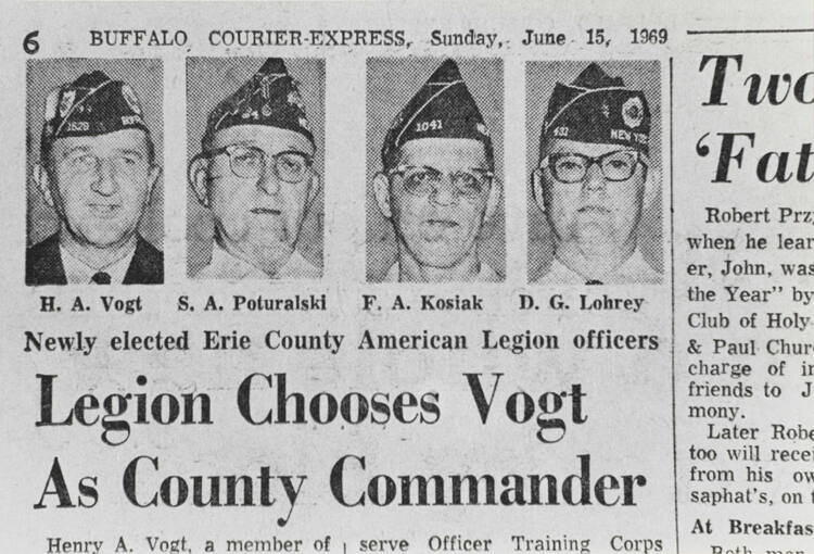 DescriptionImage of a newspaper, Buffalo Courier Express, dated June 15, 1969 with a photograph of the newly elected officers of Erie County American Legion.Copyright© Donald Blumberg