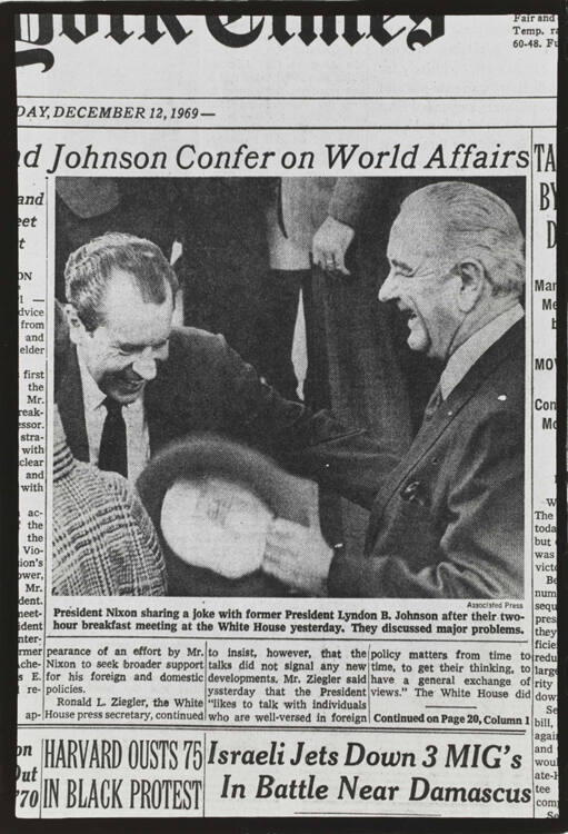 DescriptionImage of a newspaper dated December 12, 1969 with a photograph of President Nixon next to former President Lyndon B. Johnson - both laughing.Copyright© Donald Blumberg