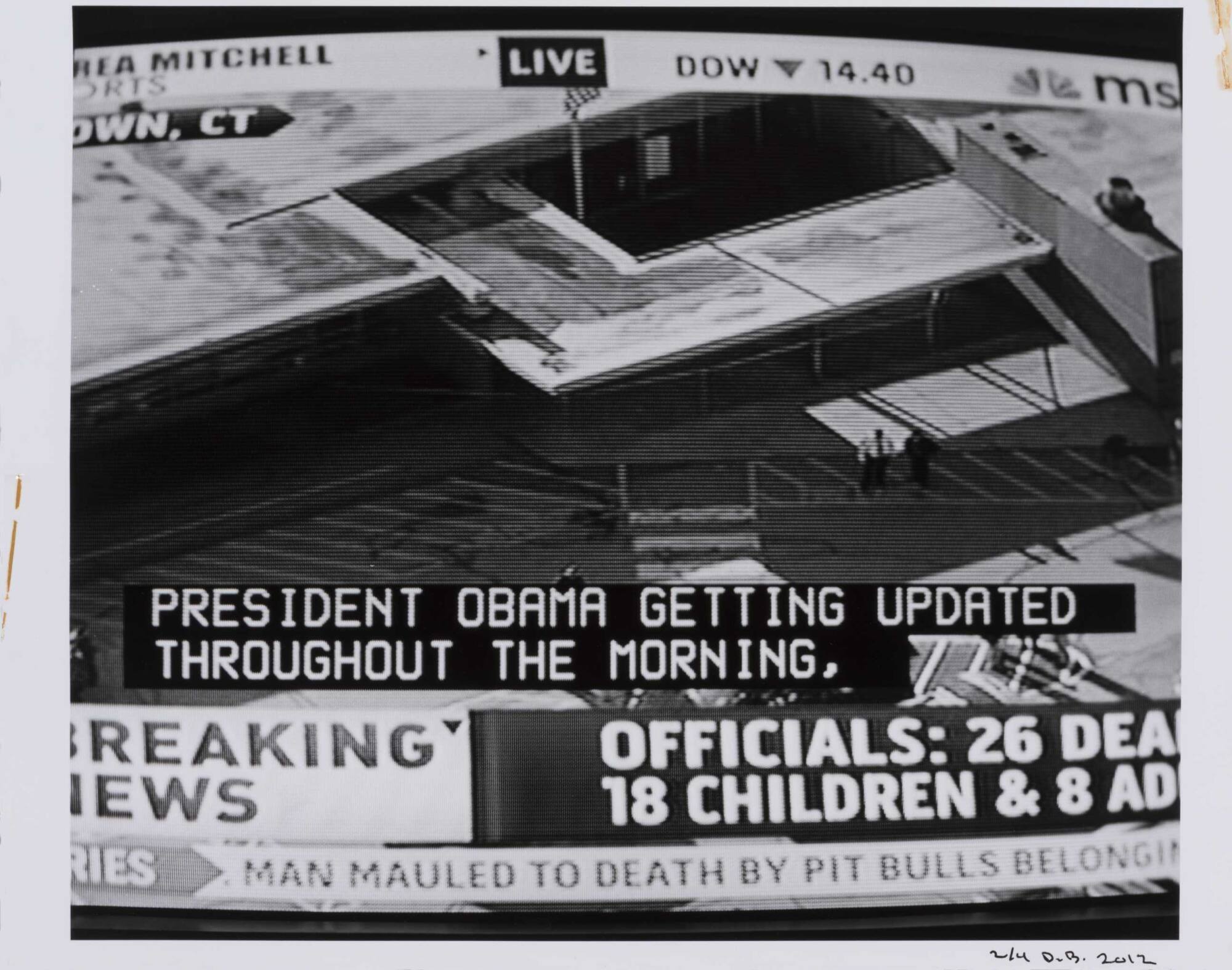 DescriptionImage of a television screen showing an aerial view of a school building with subtitles "PRESIDENT OBAMA GETTING UPDATED..."Copyright© Donald Blumberg