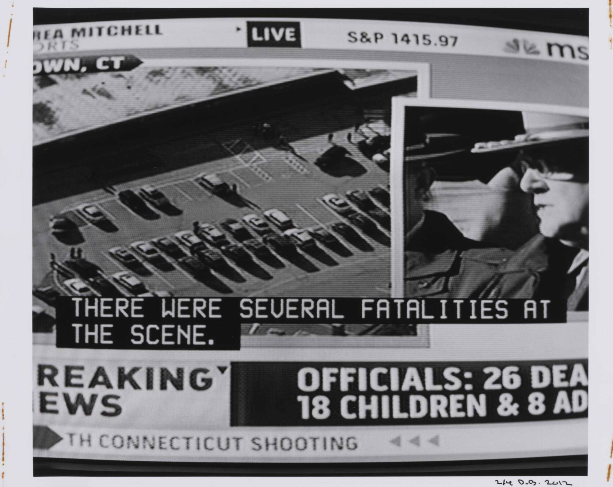 DescriptionImage of a television screen showing an aerial view of a parking lot with subtitles "THERE WERE SEVERAL FATALITIES AT...”Copyright© Donald Blumberg