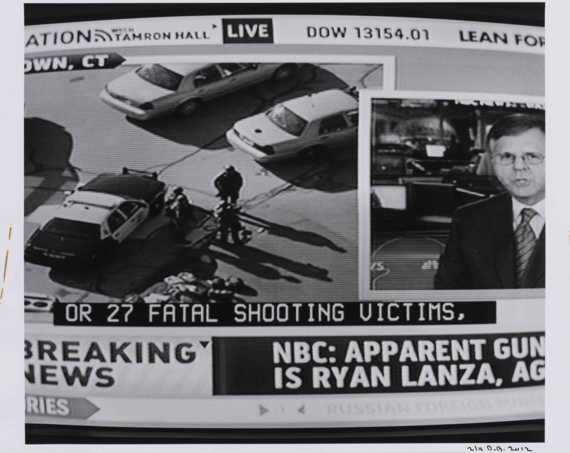 DescriptionImage of a television screen showing a parking lot and a news anchor with subtitles "OR 27 FATAL SHOOTING VICTIMS."Copyright© Donald Blumberg