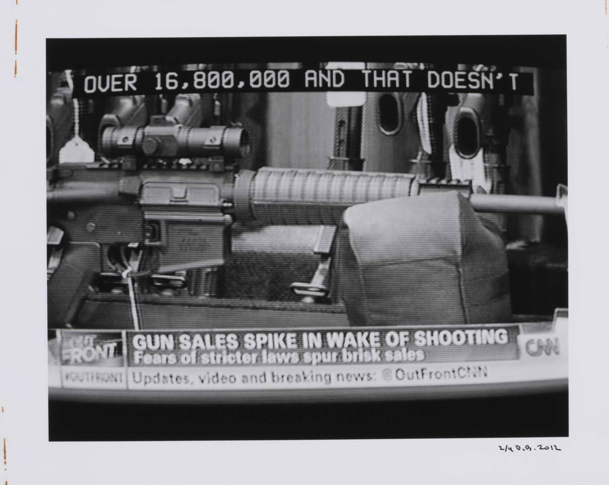 DescriptionImage of a television screen showing a machine gun along with subtitles "OVER 16,800,000..."Copyright© Donald Blumberg