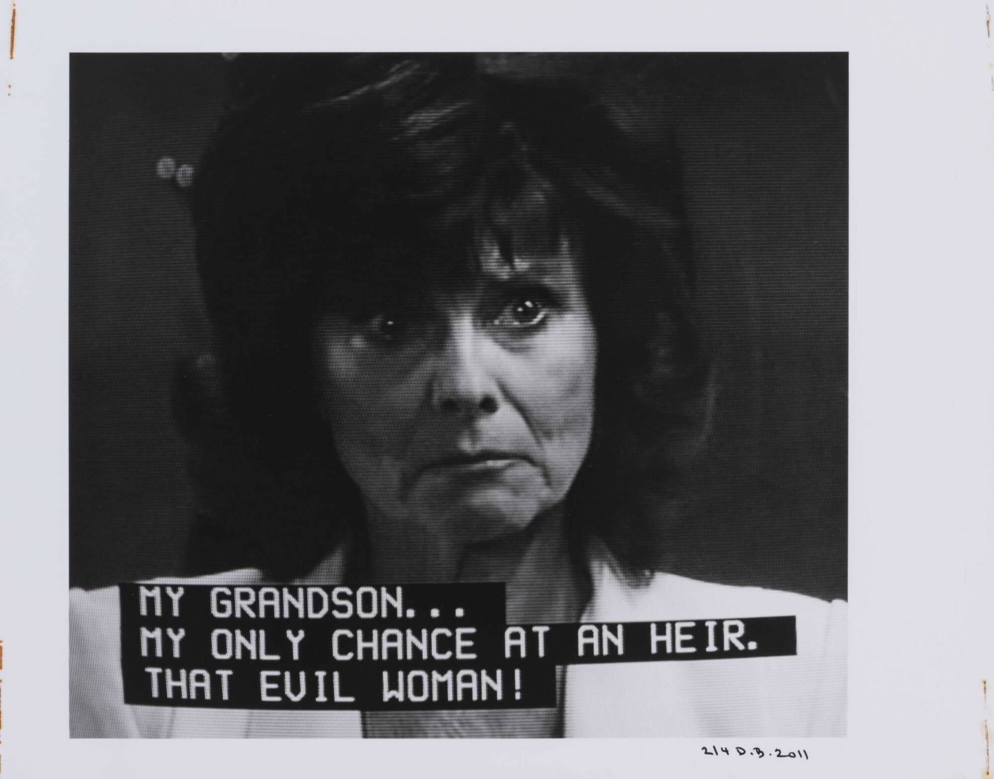 DescriptionPixelated image from a television screen of a woman with short, dark hair and a serious look on her face along with subtitles "MY GRANDSON...MY ONLY CHANCE AT AN HEIR. THAT EVIL WOMAN!"Copyright© Donald Blumberg