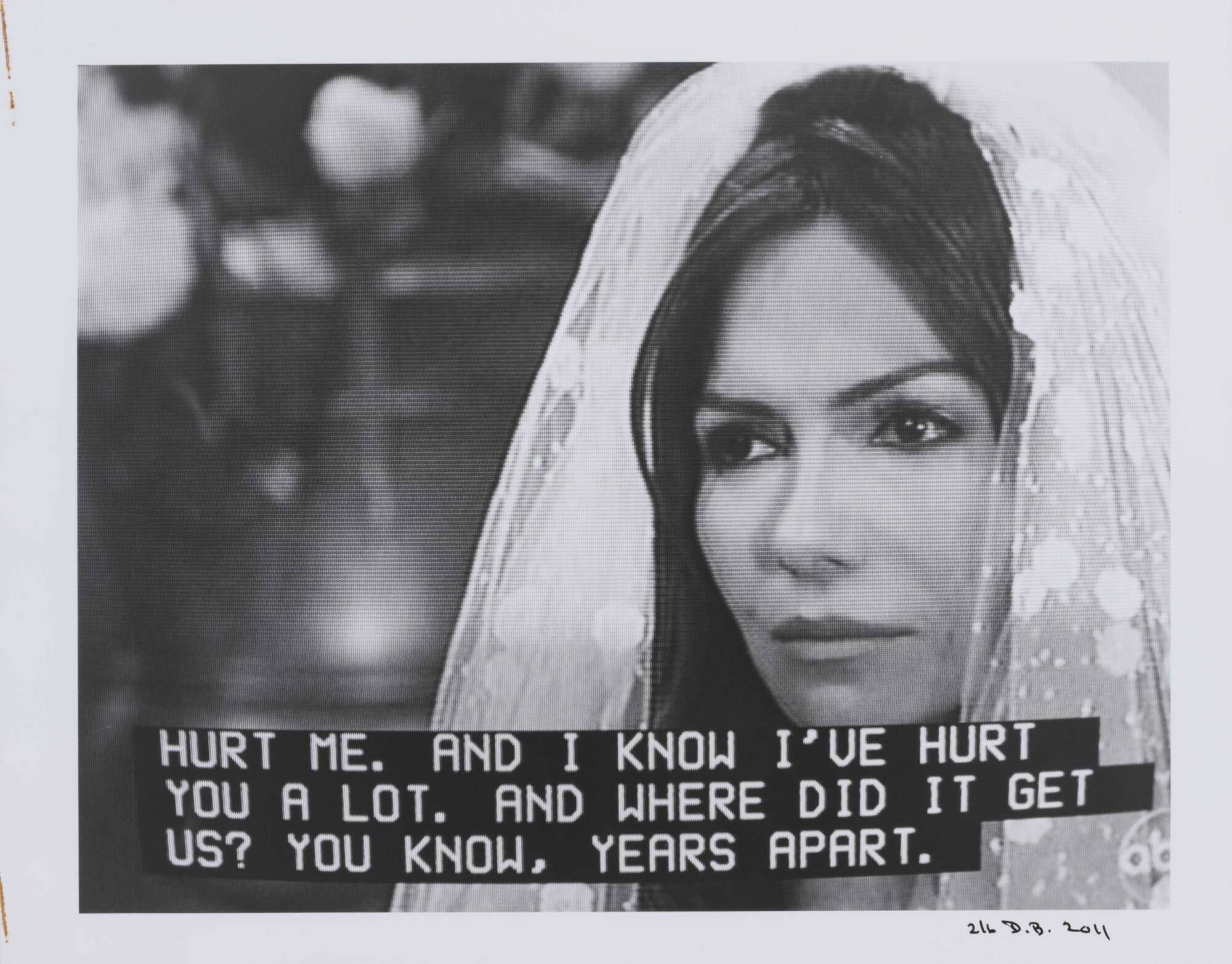 DescriptionPixelated image from a television screen of a woman wearing a wedding veil along with subtitles "HURT ME. AND I KNOW I'VE HURT YOU A LOT. AND WHERE DID IT GET US? YOU KNOW, YEARS APART."Copyright© Donald Blumberg