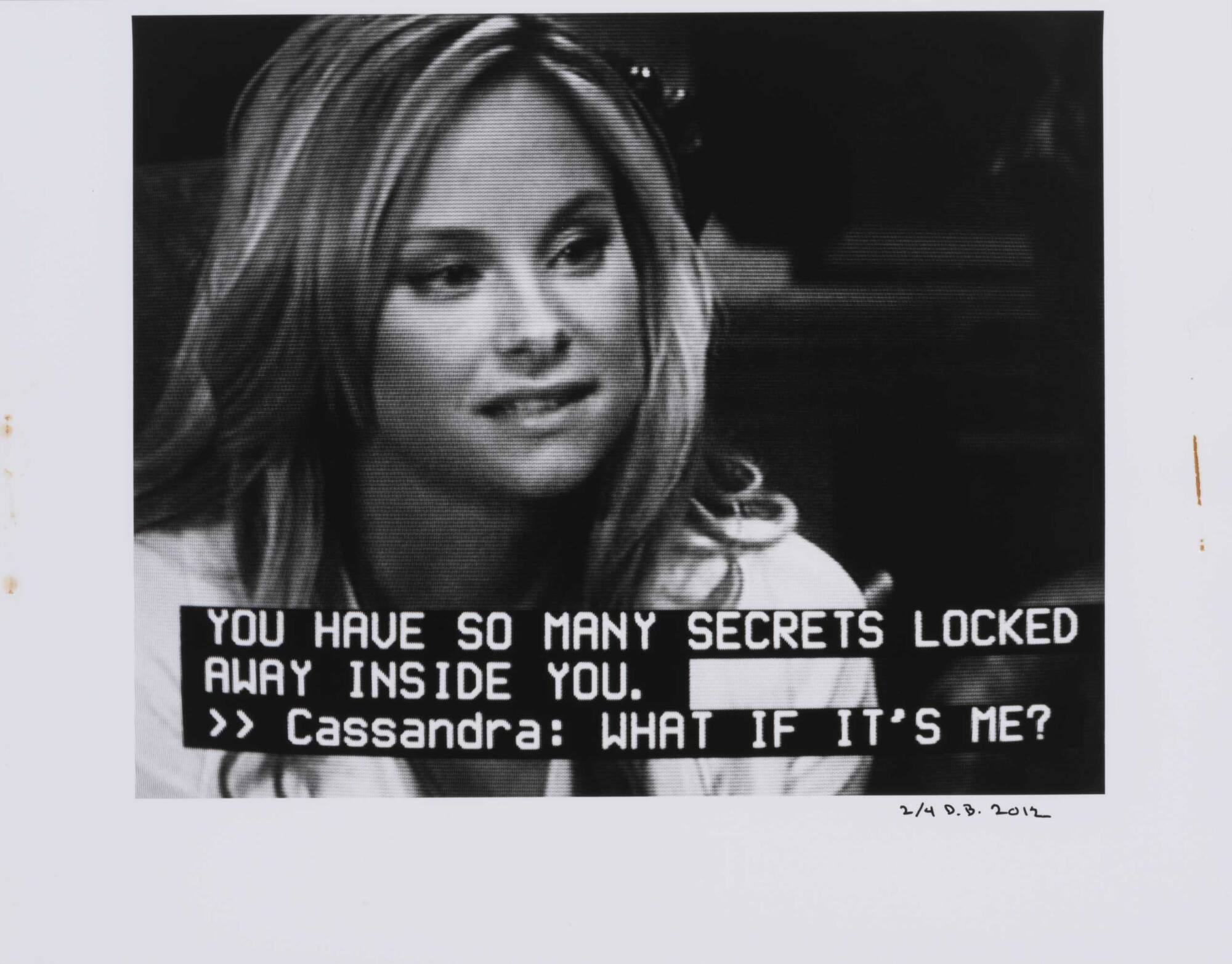 DescriptionPixelated image from a television screen of a woman with long straight hair and subtitles "YOU HAVE SO MANY SECRETS LOCKED AWAY INSIDE YOU. >>Cassandra: WHAT IF IT'S ME?"Copyright© Donald Blumberg
