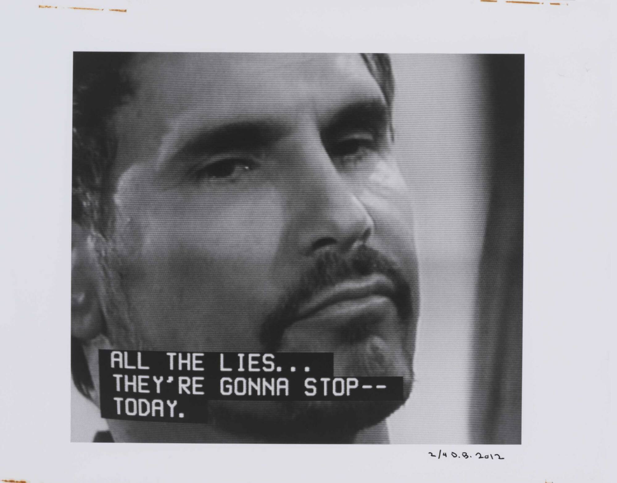 DescriptionPixelated image from a television screen of a man frowning with goatee along with subtitles "ALL THE LIES...THEY'RE GONNA STOP--TODAY."Copyright© Donald Blumberg
