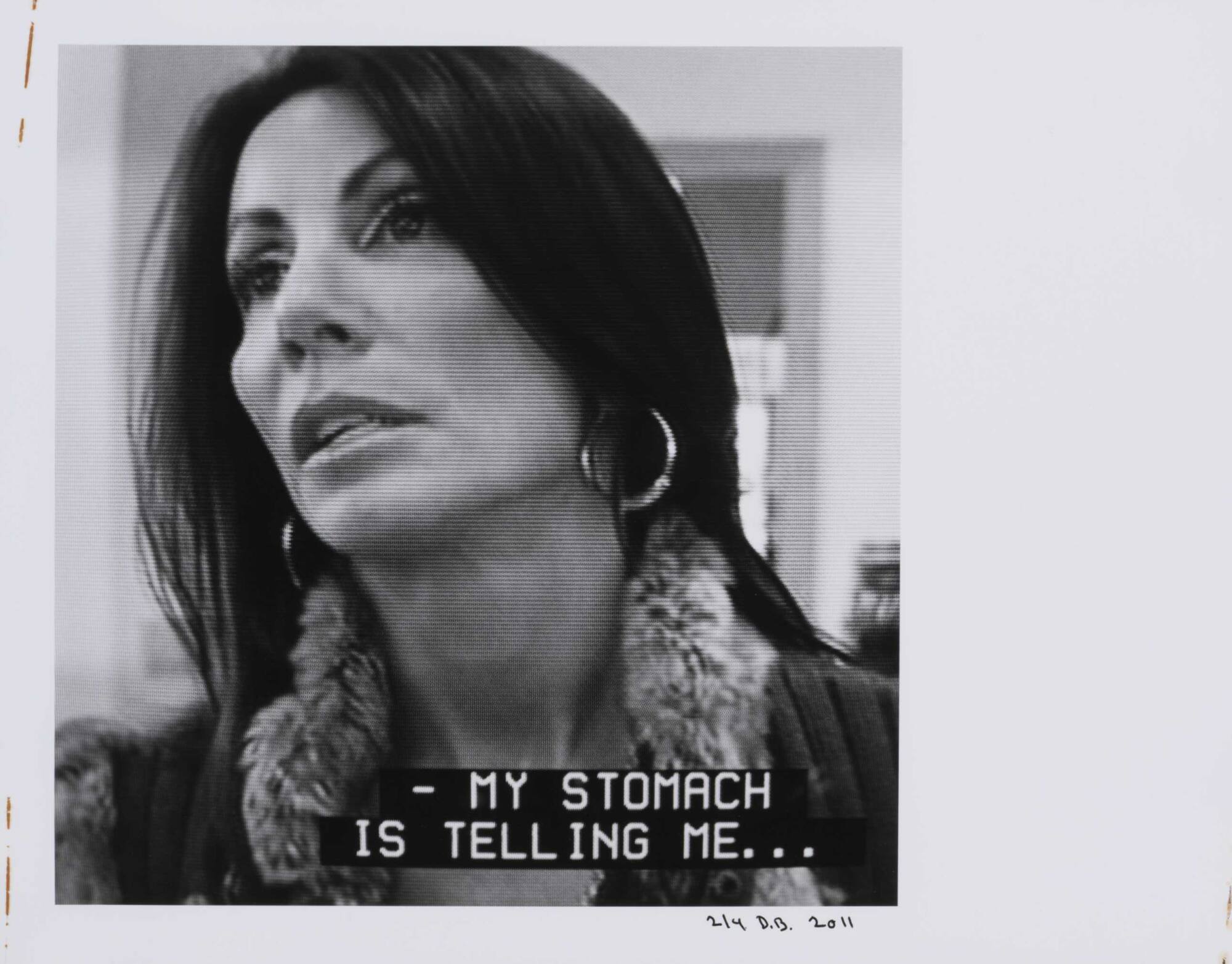 DescriptionPixelated image from a television screen of a woman with hoop earrings and fur line top along with subtitles "- MY STOMACH IS TELLING ME..."Copyright© Donald Blumberg