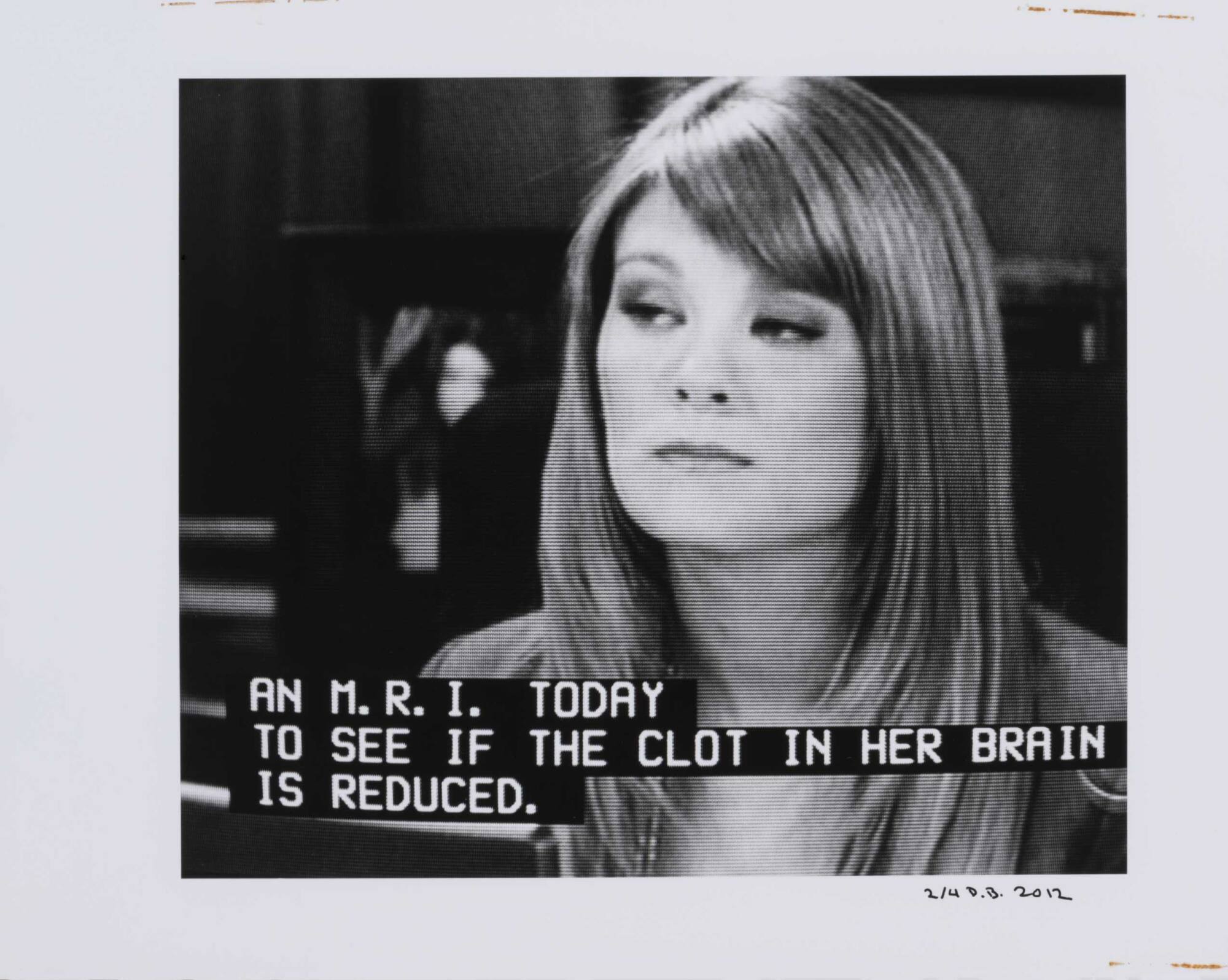 DescriptionPixelated image from a television screen of a woman looking skeptical along with subtitles "AN M.R.I. TODAY TO SEE IF THE CLOT IN HER BRAIN IS REDUCED."Copyright© Donald Blumberg