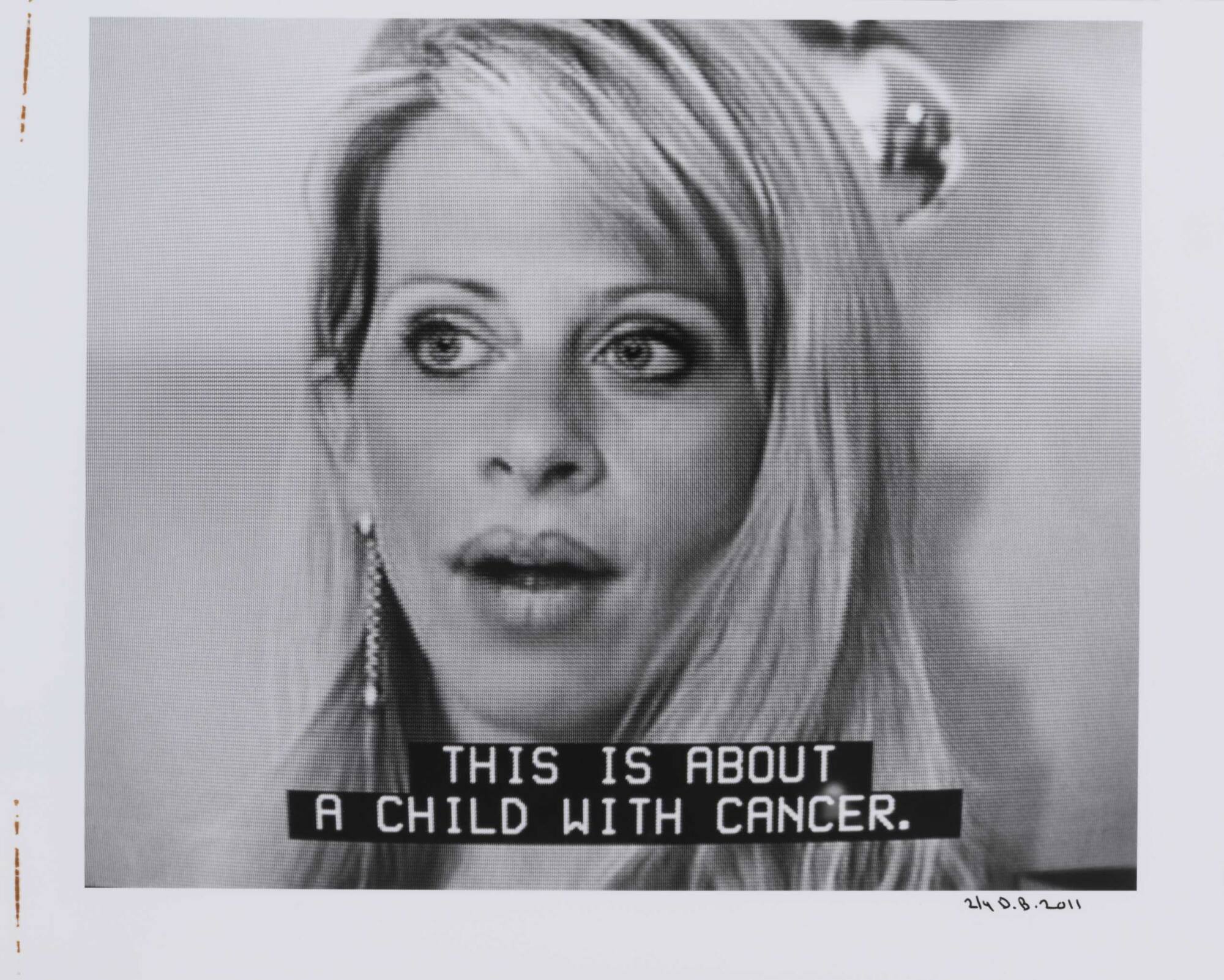 DescriptionPixelated image from a television screen of a woman with wide eyes and mouth agape along with subtitles "THIS IS ABOUT A CHILD WITH CANCER."Copyright© Donald Blumberg