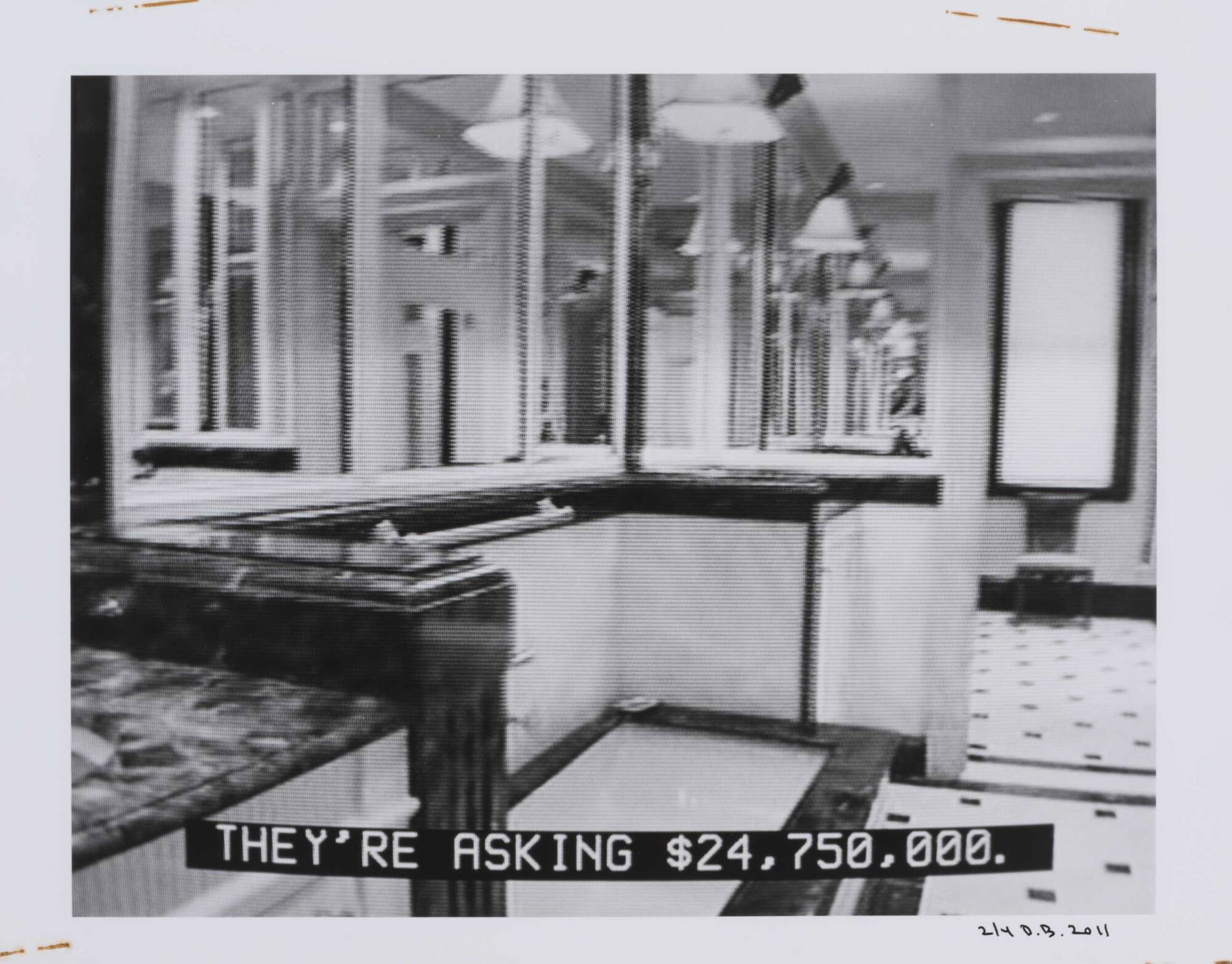 DescriptionPixelated image from a television screen of a bathroom with wall of mirrors and subtitles "THEY'RE ASKING $27,750,000."Copyright© Donald Blumberg