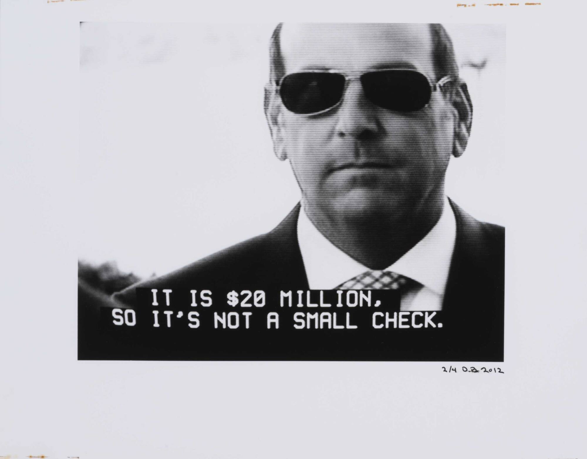 DescriptionPixelated image from a television screen of a man sunglasses, suit and tie along with subtitles "ITS $20 MILLION, SO IT'S NOT A SMALL CHECK."Copyright© Donald Blumberg