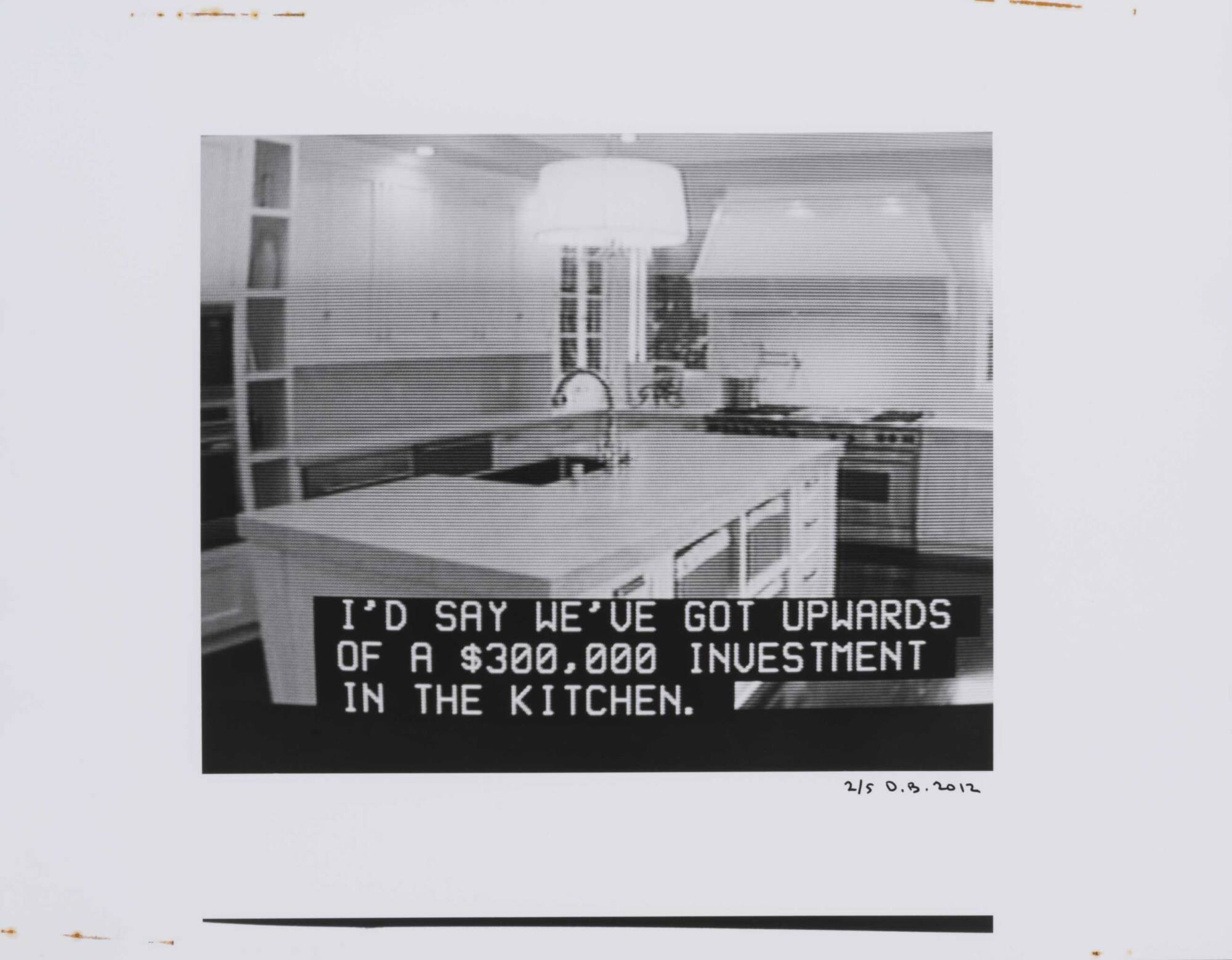 DescriptionPixelated image from a television screen of a new kitchen with island in center and subtitles "I'D SAY WE'VE GOT UPWARDS OF A $300,000 INVESTMENT IN THE KITCHEN."Copyright© Donald Blumberg