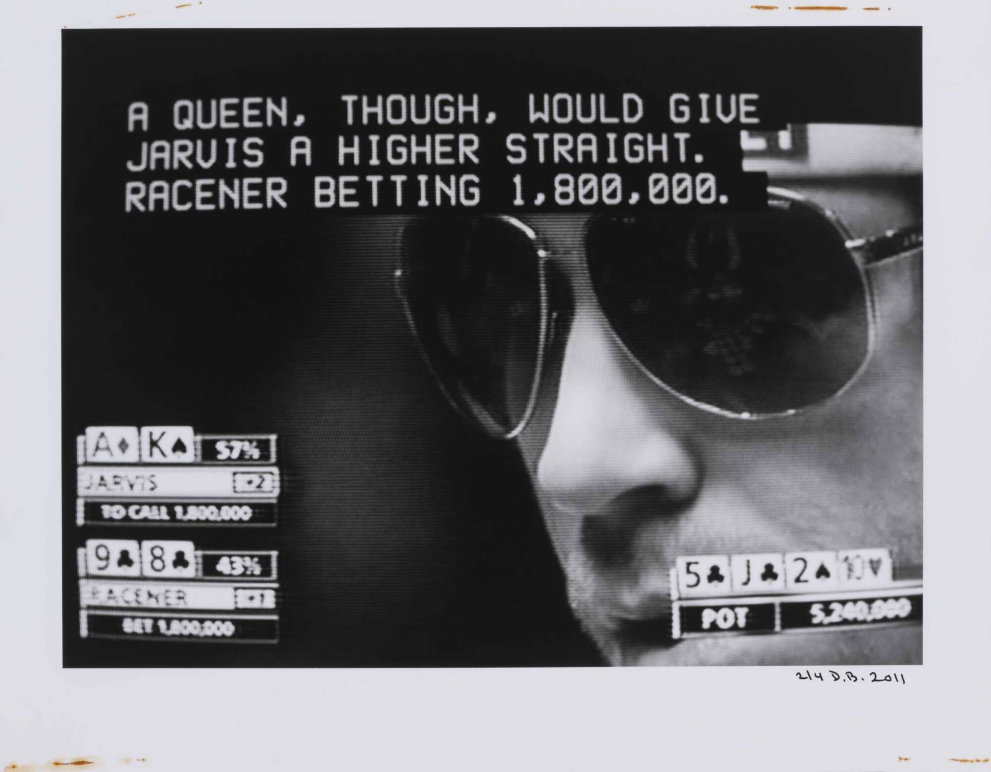 DescriptionPixelated image from a television screen of a man wearing aviator sunglass along with subtitles "A QUEEN, THOUGH, WOULD GIVE JARVIS A HIGHER STRAIGHT. RACENER BETTING 1,000,000."Copyright© Donald Blumberg