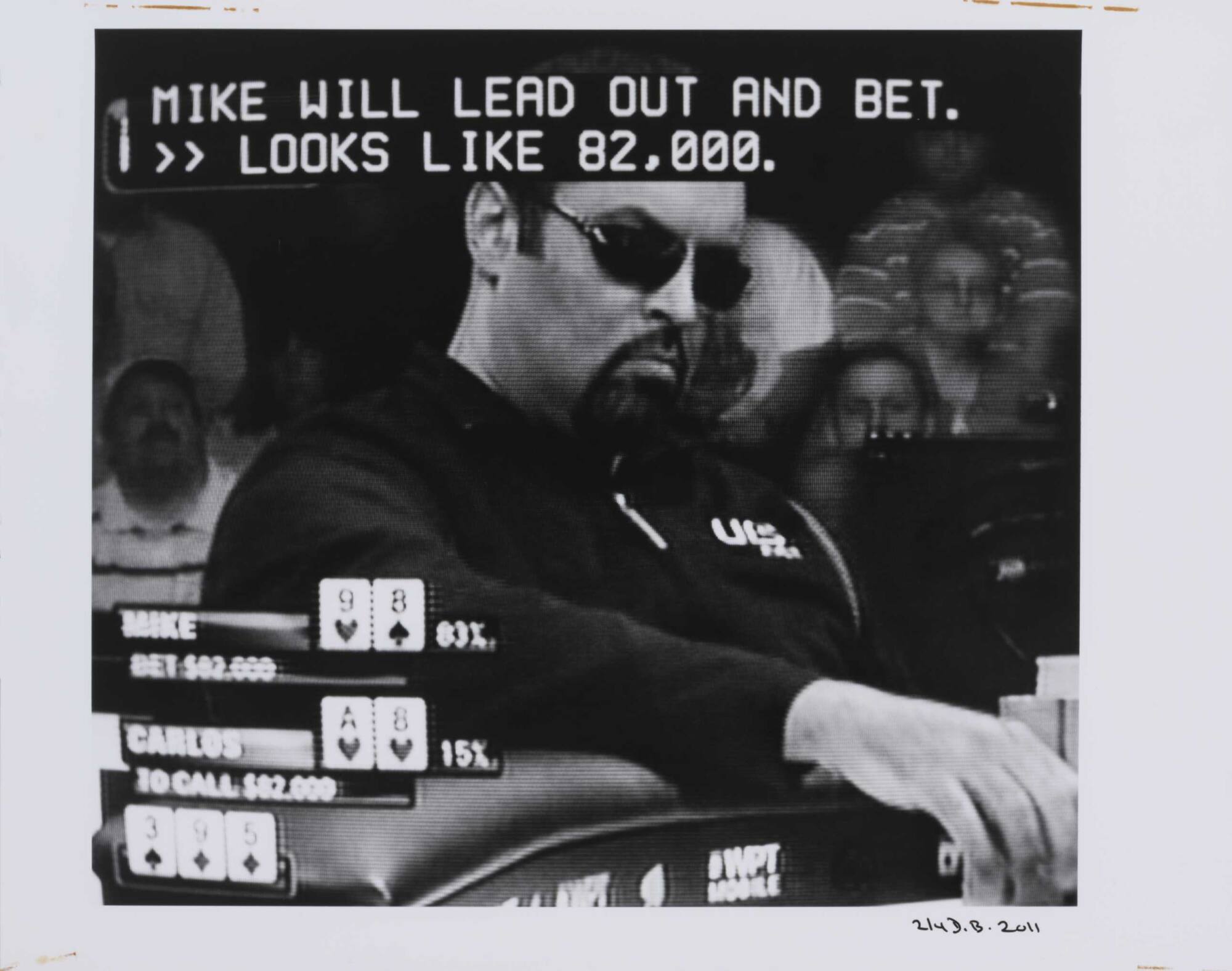 DescriptionPixelated image from a television screen of a man seated at a poker table with onlookers in background and subtitles "MIKE WILL LEAD OUT AND BET >>LOOKS LIKE 82,000."Copyright© Donald Blumberg