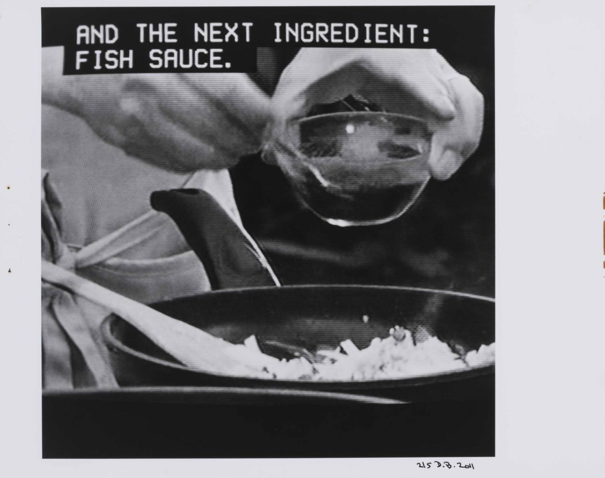 DescriptionPixelated image from a television screen showing a hand holding a clear bowl of liquid above a skillet with subtitles "AND THE NEXT INGREDIENT: FISH SAUCE."Copyright© Donald Blumberg