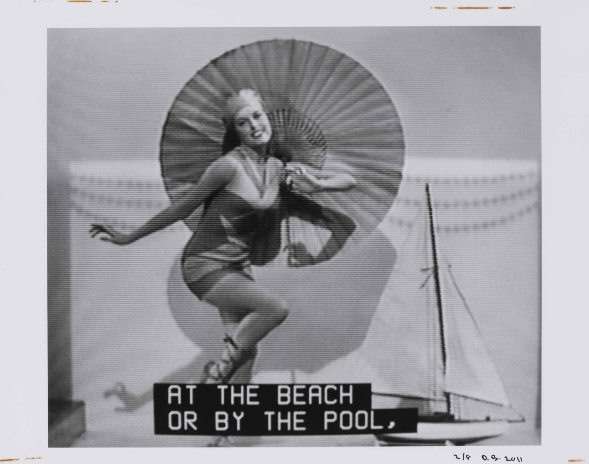 DescriptionPixelated image from a television screen of a woman holding a sun umbrellas while smiling, and subtitles "AT THE BEACH OR BY THE POOL."Copyright© Donald Blumberg