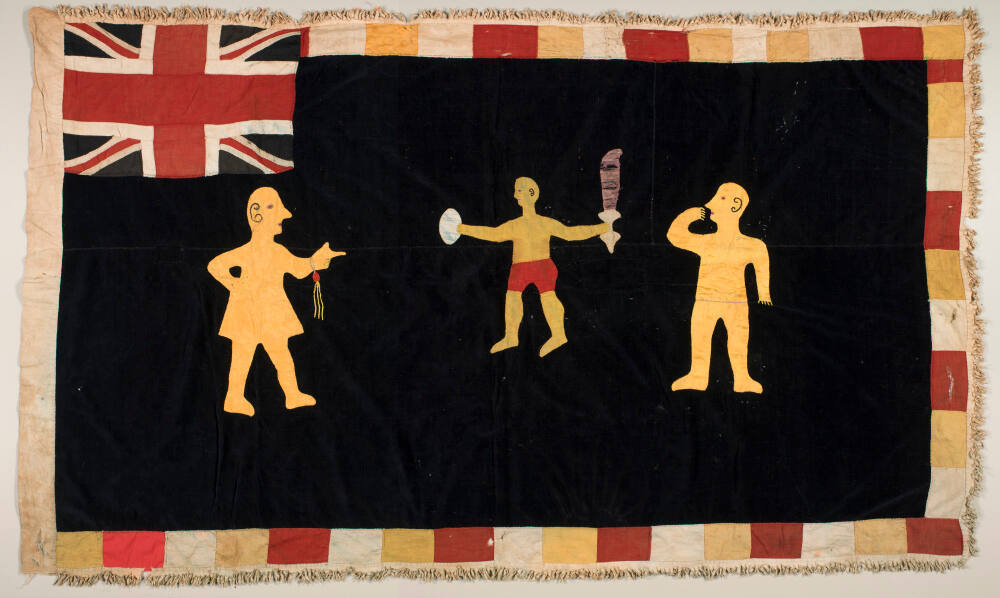 DescriptionA rectangular hand-sewn flag with appliquéd symbols. In the top left section is an insert of the British Union Jack. The remaining field of black velvet has three appliquéd images of men. The left figure is shown carrying in one hand a whip; the central figure holds in one hand an egg and the other a sword, while the right figure has his right hand to the mouth. The composition is framed by a border decorated with red, yellow and white handsewn rectangles.Provenance
