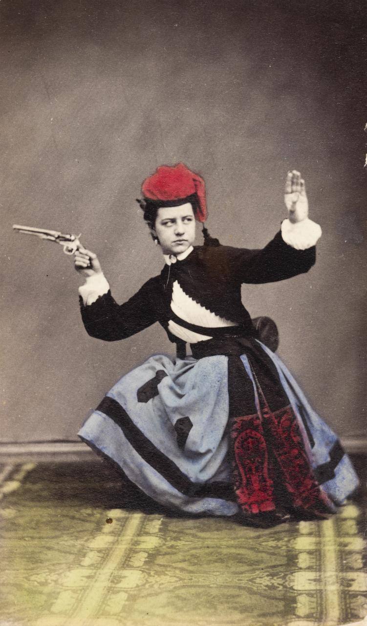 DescriptionHand colored cart-de-visite of woman dresssed in skirt with sash and hat kneeling on rug and holding pistol.