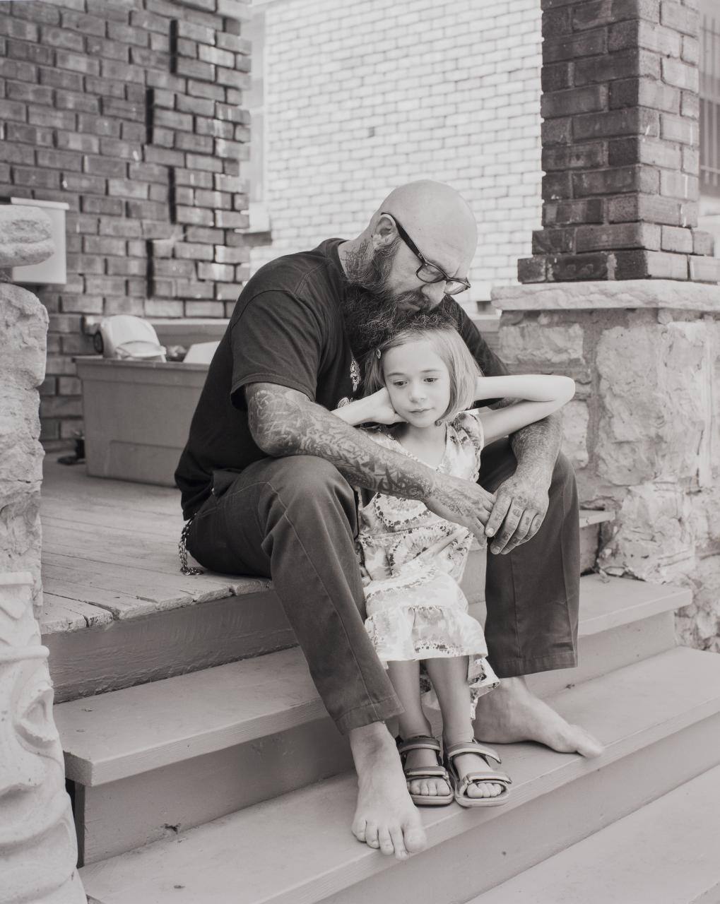 DescriptionImage of tattooed man with beard and glasses sitting on porch steps with arms loosely around little girl wearing dress.Copyright© Adam J. Long