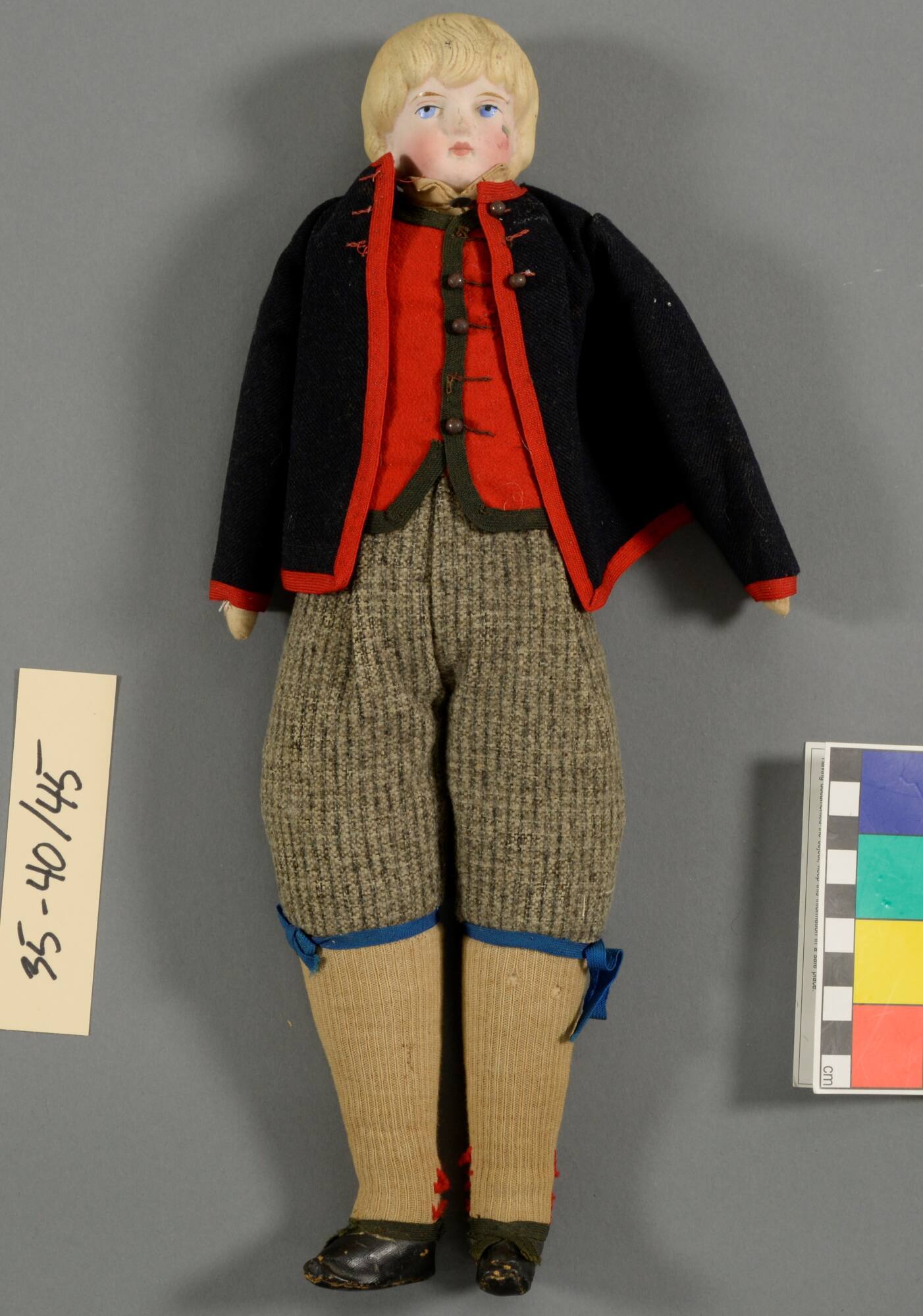DescriptionMan in grey knee trousers, red vest, black jacket, tan stockings with red clocks, and black top hat.ProvenancePearle Scales Moore (1867-1934), Peoria, IL, by 1934 [1];