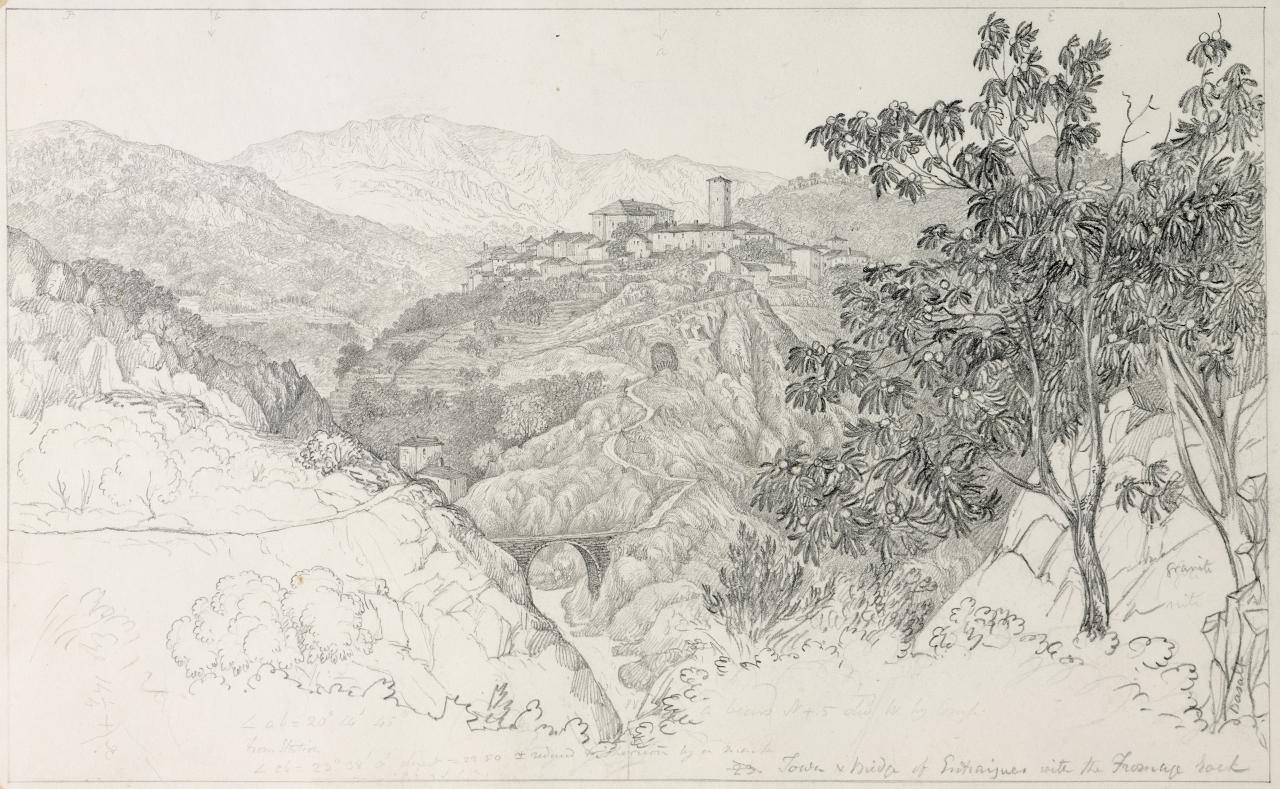 On sheet recto, bottom, in black pen: "Town of Entraigues shewing the situation of the "Fromage" on the Granite Rock".