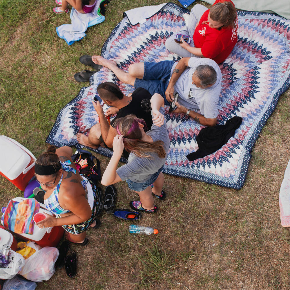 Terry Evans was commissioned by the Amon Carter Museum to photograph the Trinity River through Fort Worth, Texas. This section of the river is an engineering feat, flowing through human-made channels to control flooding. Approaching the crowded river on a Fourth of July weekend, She quickly understood that the river was about people and not necessarily about the scenic view. A master of aerial photography, Evans made this elevated view of people enjoying a picnic on her first day of the project.