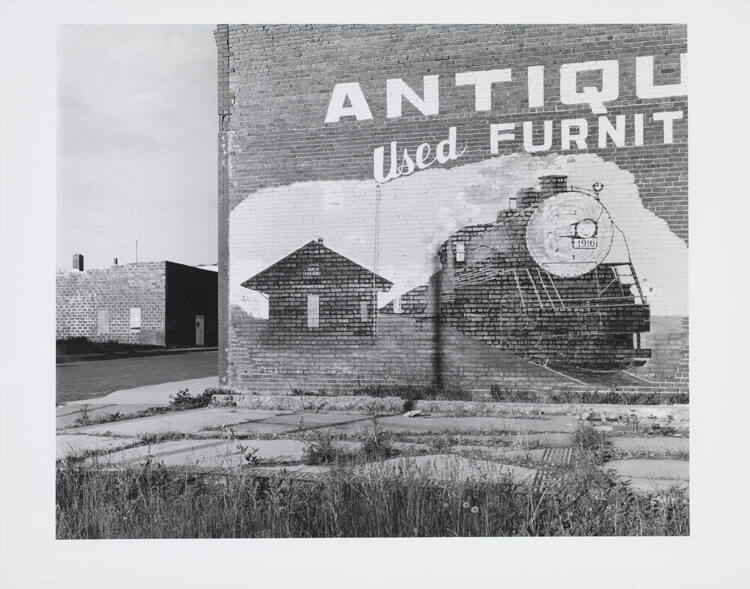 DescriptionImage of a brick building with a mural painted on the side depicting a train.