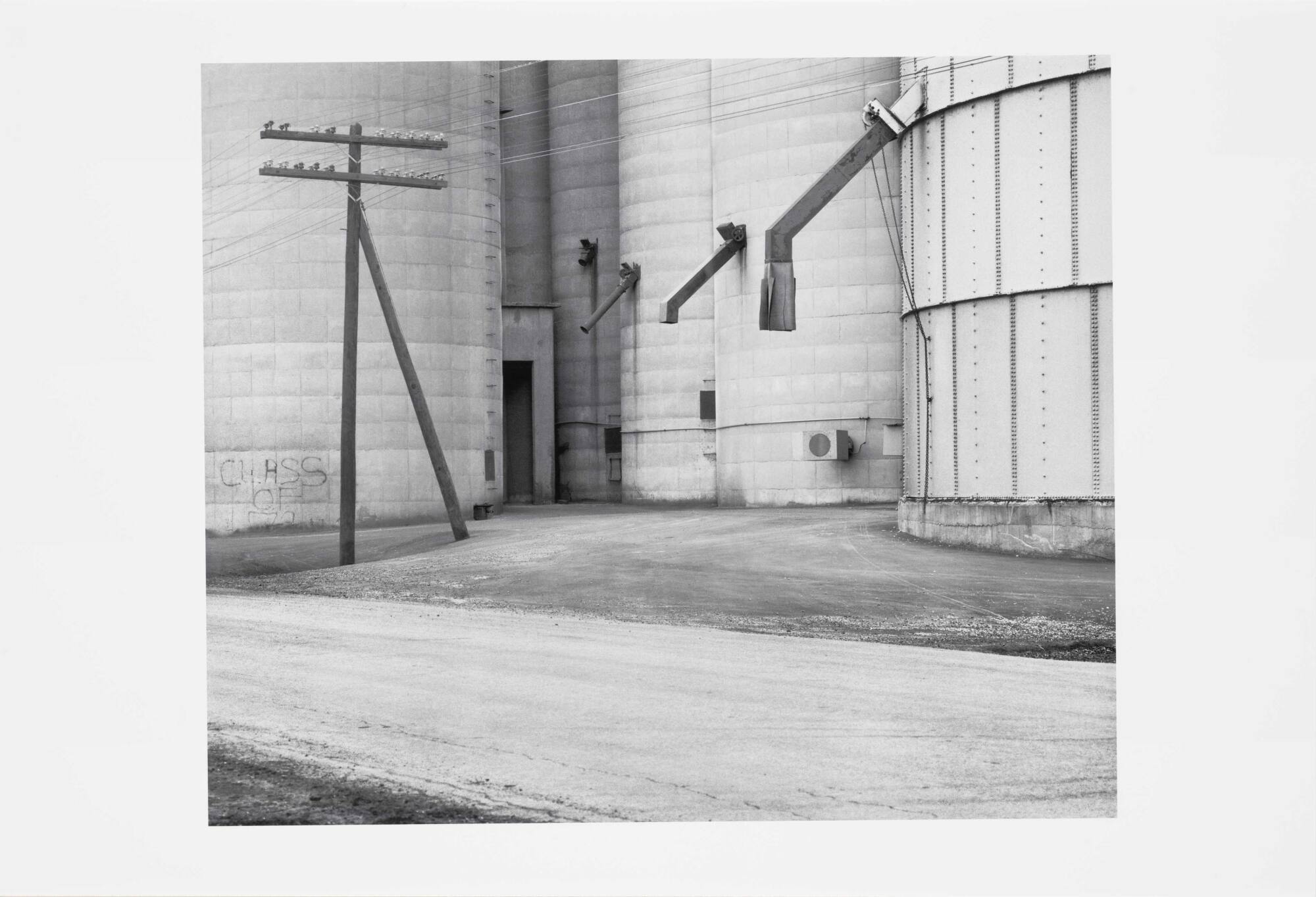 DescriptionImage of power lines and bottoms of grain elevator with "CLASS OF 72" graffiti on the front.Copyright© David Plowden