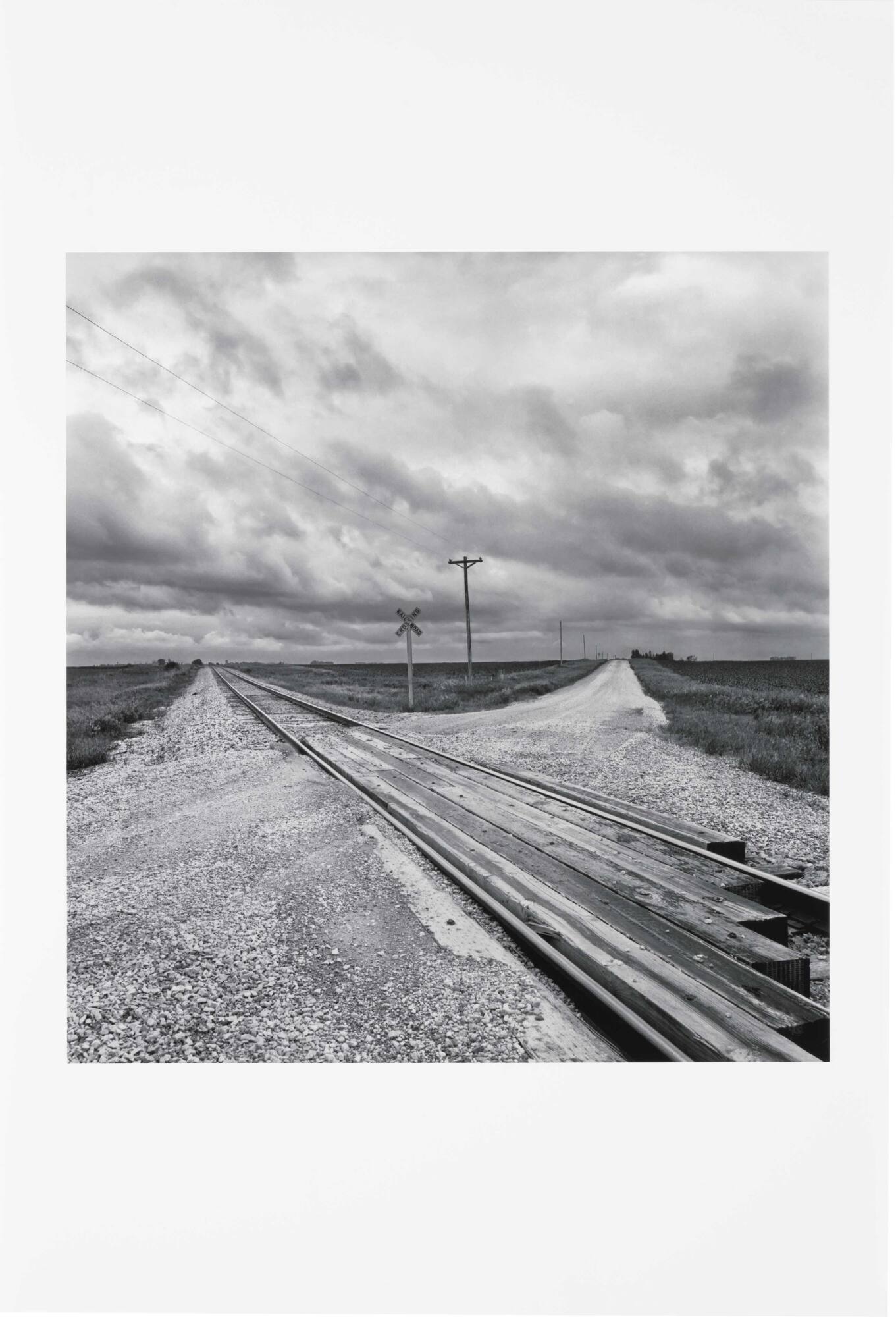 DescriptionImage of railroad tracks crossing over a gravel road with a cloudy sky.Copyright© David Plowden