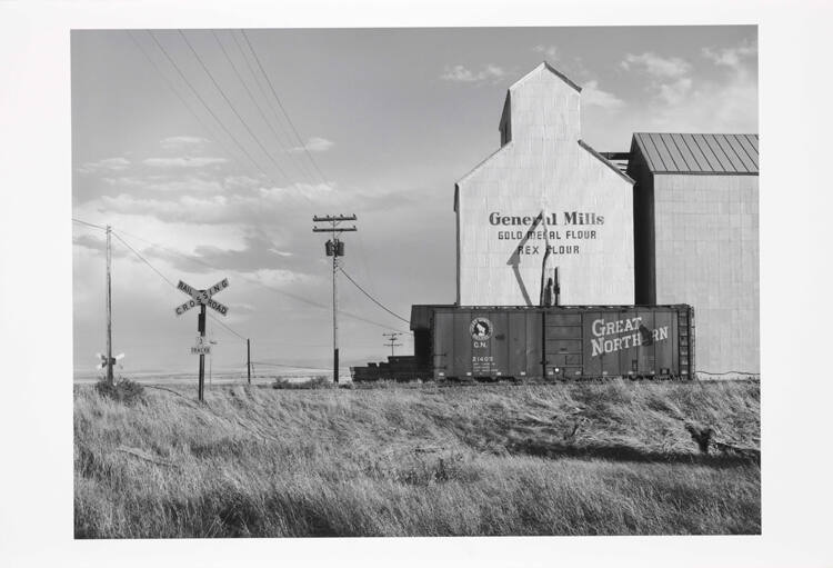 DescriptionImage of General Mills grain elevator and Great Northern railway car near crossing sign.Copyright© David Plowden