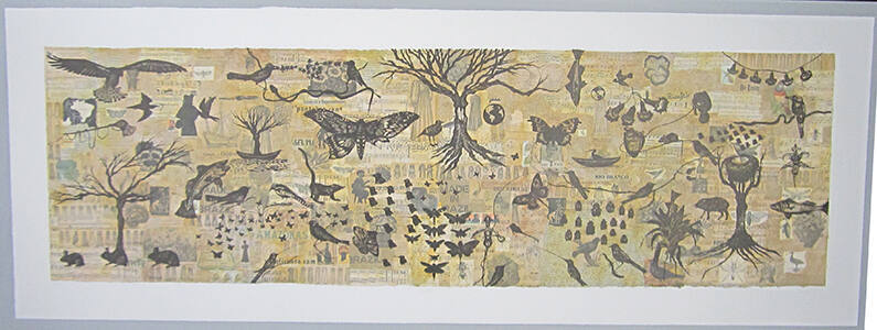 DescriptionA series of black/brown birds, trees, butterflies, animals, etc. over a maplike background of people, places, sone easy to read such as Amazon, Brazil. Its horizontal format makes it easy to identify.