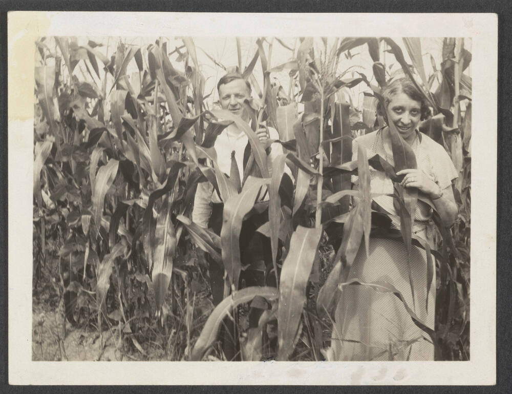DescriptionImage of man and woman peering out from behind stalks of corn.