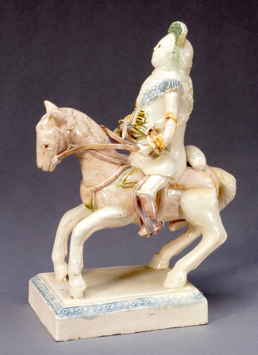 DescriptionMounted cavalryman (Hudibras?) with drawn saber in right hand, on galloping horse. Cream glaze; upper body of horse, rider's boots, mauve; visor of cap, green; saddle, stirrups, and spirs touched with green; epaulets, blue; coat and saddle touched with orange. Blue diamond border around top of base.