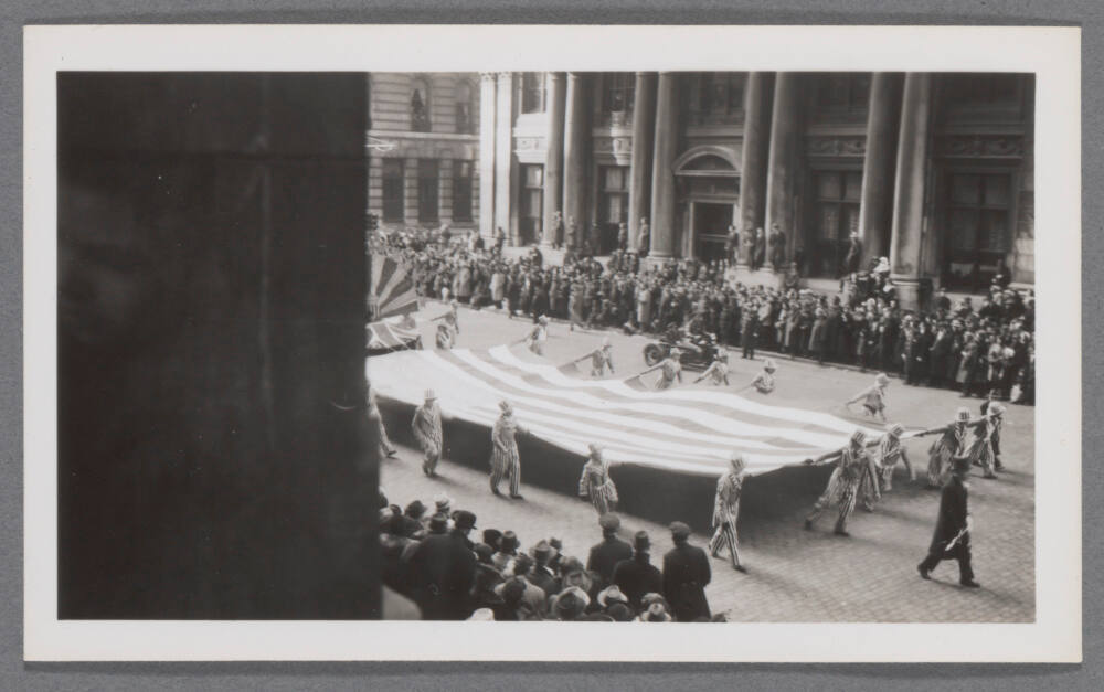 DescriptionImage of people carrying a giant flag in a parade.