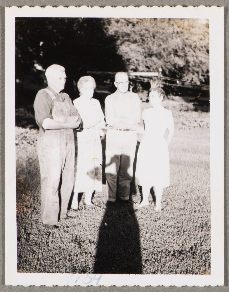 DescriptionImage of two men and two women standing in yard; photographer's shadow in foreground.