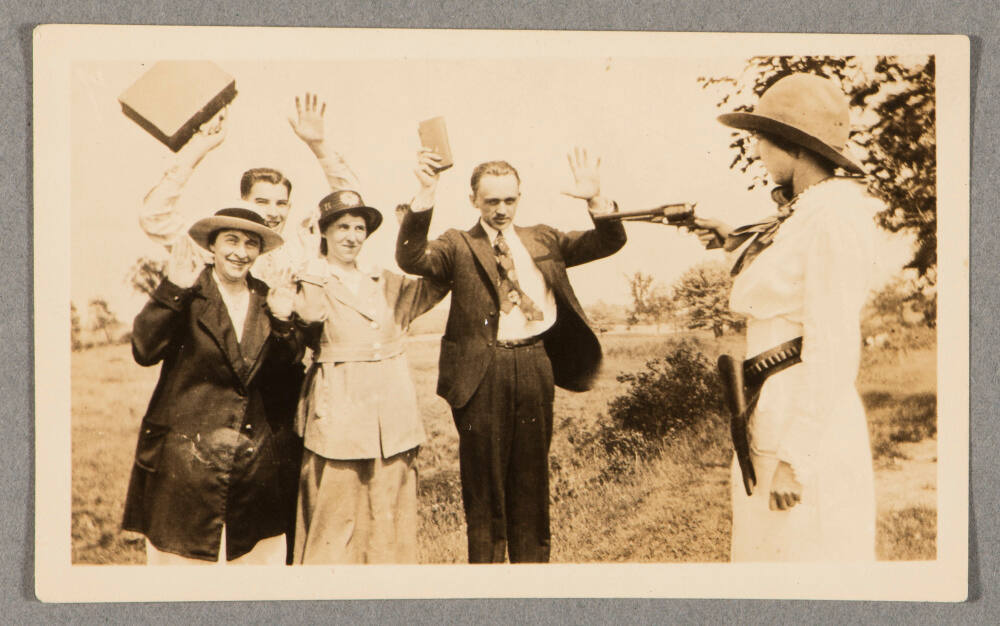DescriptionImage of woman aiming pistol at group with hands raised (all smiling).