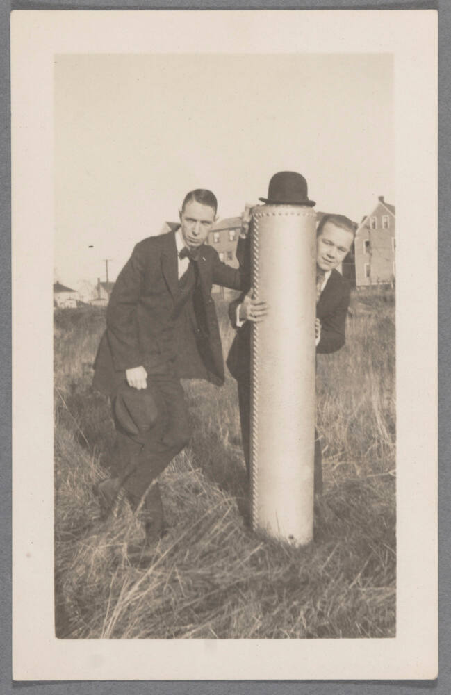 DescriptionImage of two men wearing suits standing in field with homes in distance.