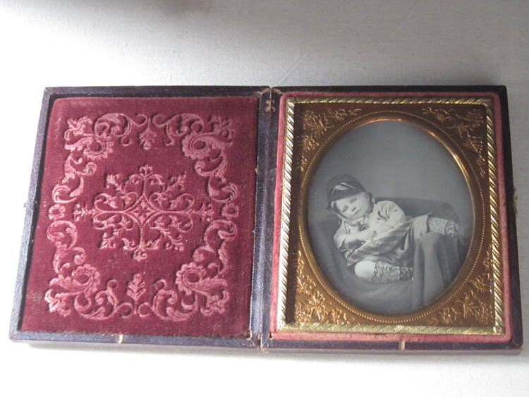 DescriptionSixth plate cased daguerreotype housed in brass oval mat with velvet liner. Image of young child in chair wearing hat with hands in lap and leg draped over arm of chair.