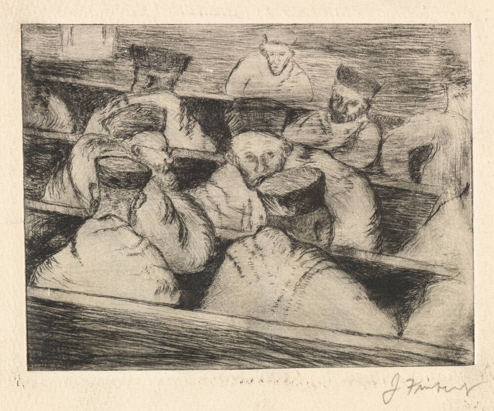 DescriptionThis print shows rabbis seated in four rows of pews, engaged in conversation. Some face away from the viewer while others have visible faces, turned to their neighbors. Each of the clearly defined seven men wear hats and are seated on benches that divide them.Copyright© Joseph and Betsy Ritz Friebert Family Partnership