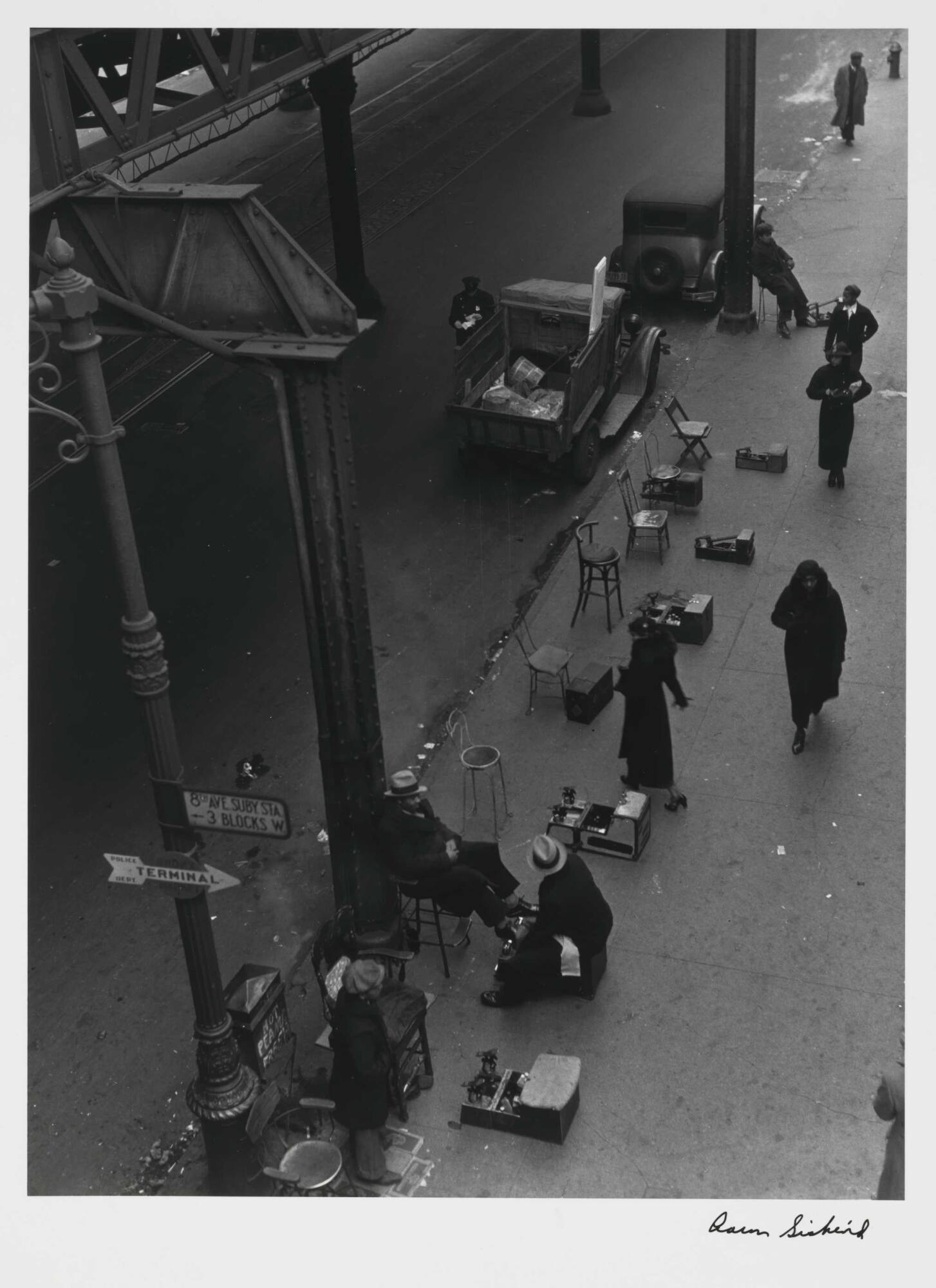 DescriptionImage looking down on street with a row of wooden chairs and shoe shine stools set up on sidewalk beneath bridge. One man is having his shoes shined while several women walk by wearing long coats.Copyright© Aaron Siskind Foundation